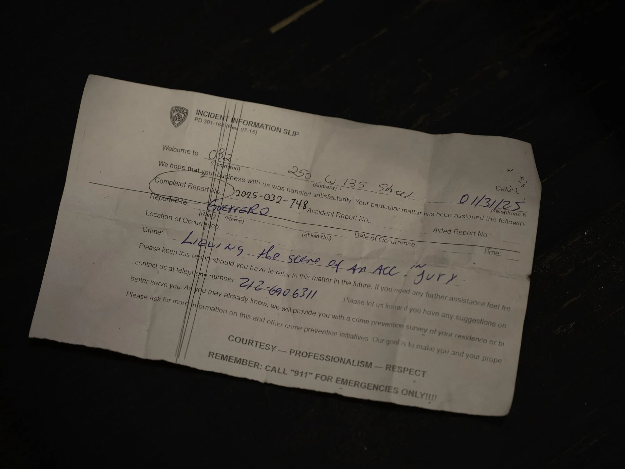 InSeven working days had past and on a rainy friday while going toward 135th to collect an order between 135th and 134th I accidently got hit by a manoeuvring car witch cause my unconsciousness right away. After fainted for a minute and didn't know where I was I woke up in the ambulance on our way to the hospital. I requested to make a phone call in order to let my friends MORE and ZALE know about my accident and condition.after being released and got home.